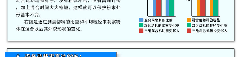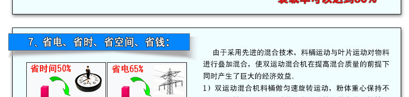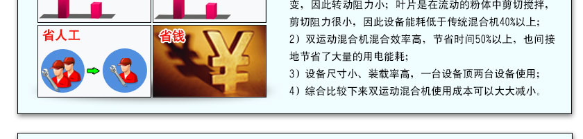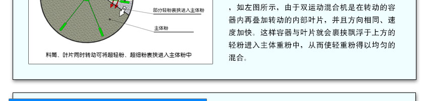 隨著混合機設備大型化,其混合效率會適當降低,為了解決這一問題我們在機器內部增加運動葉片的分布密度
