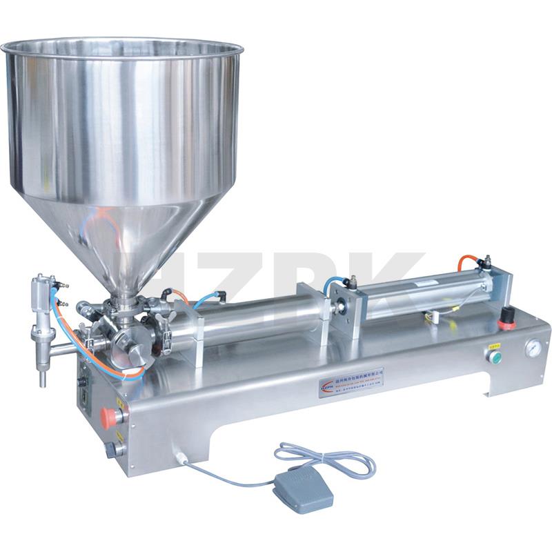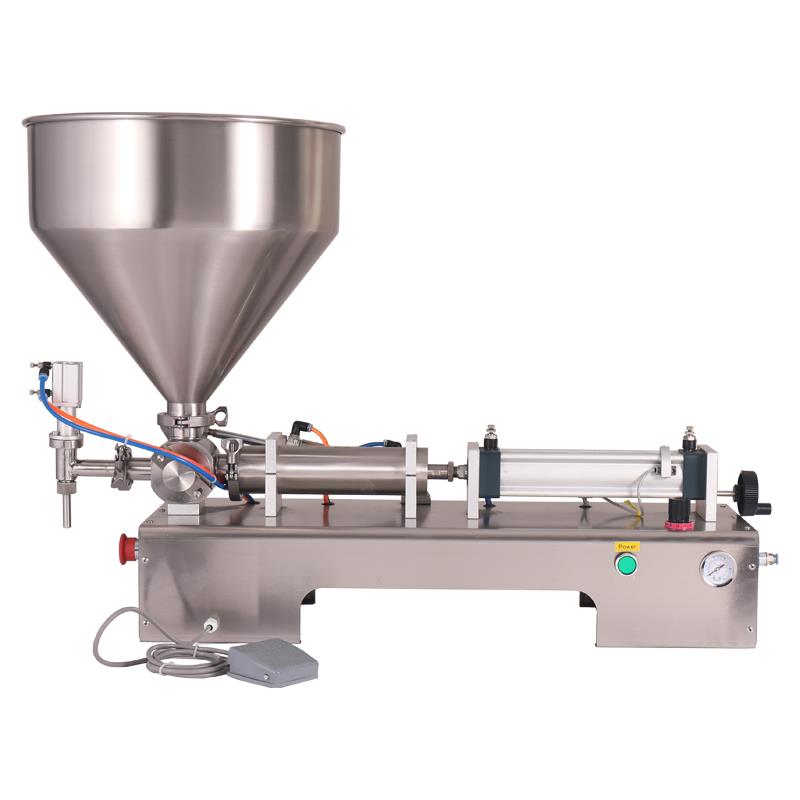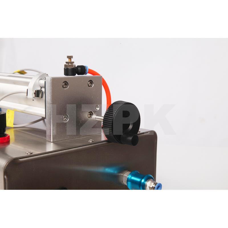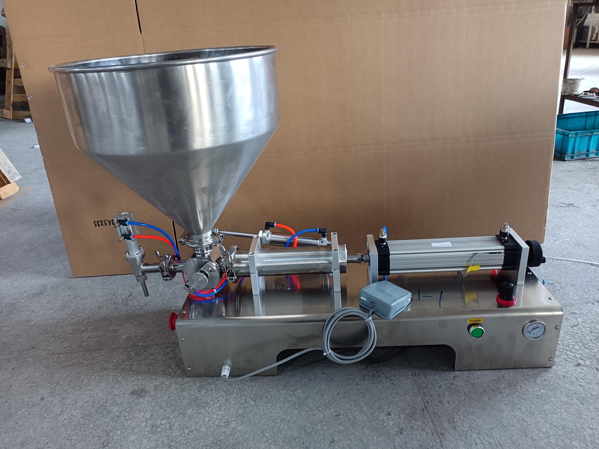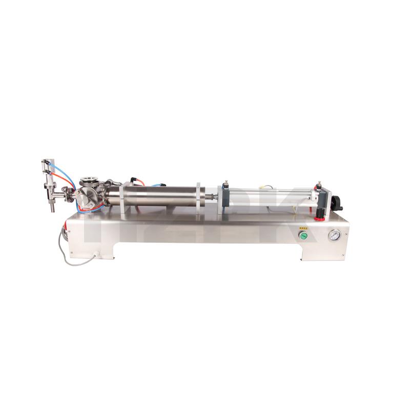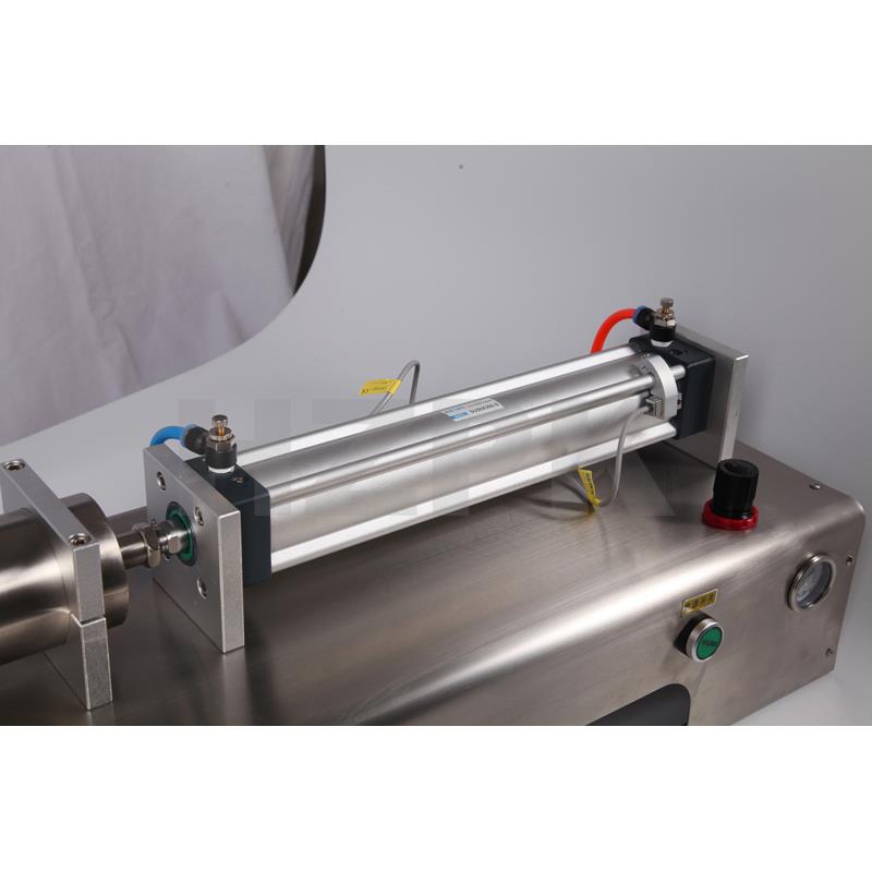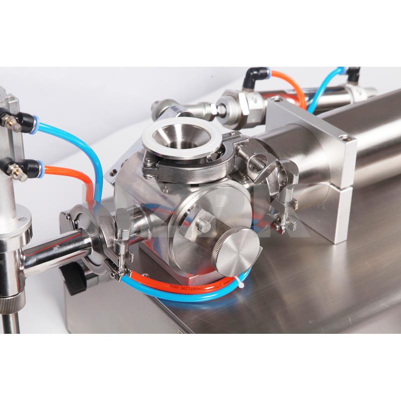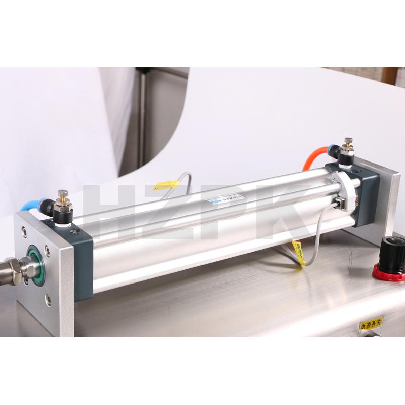 本機為半自動活塞式灌裝機,通過氣缸帶動一個活塞往復運動來抽取和打出物料,采用轉閥控制物料流向,用磁性開關控制氣缸的行程,可調節灌裝量,可以調解汽缸的進氣量實現快速或者慢速灌裝。