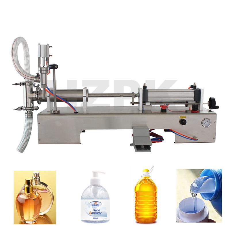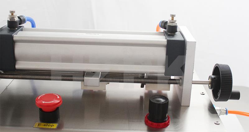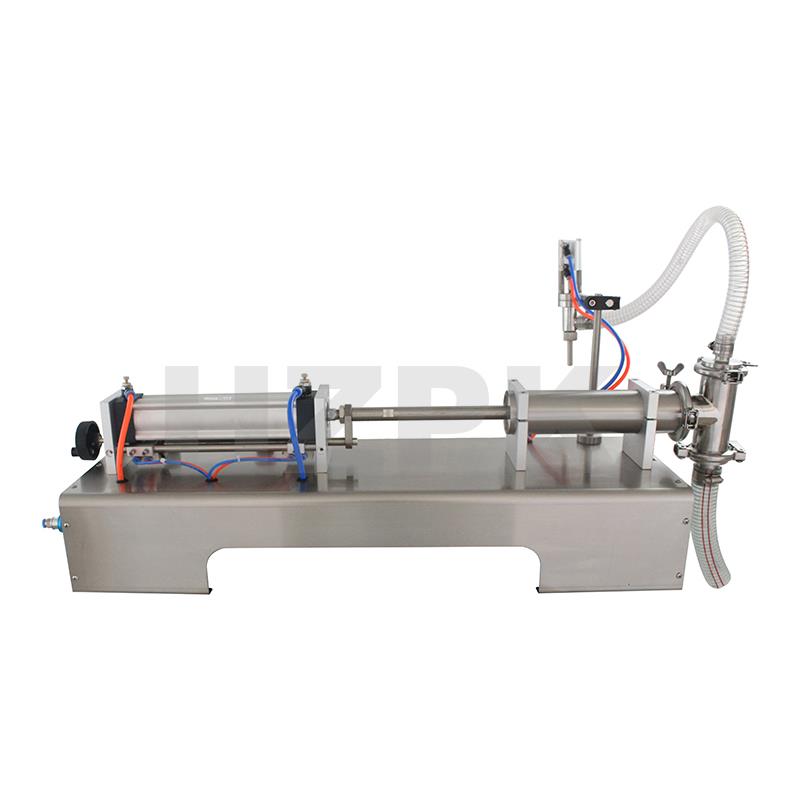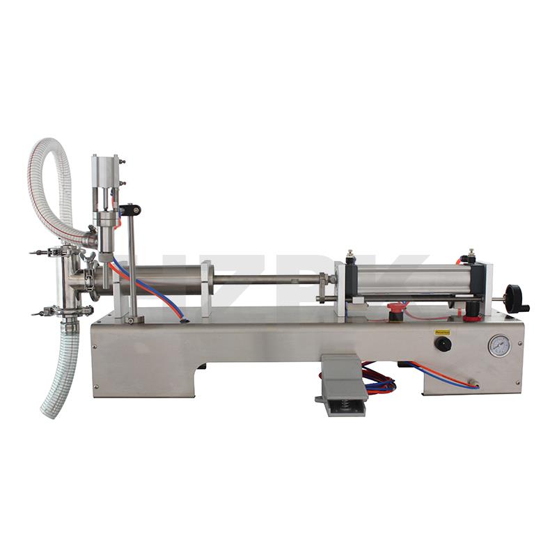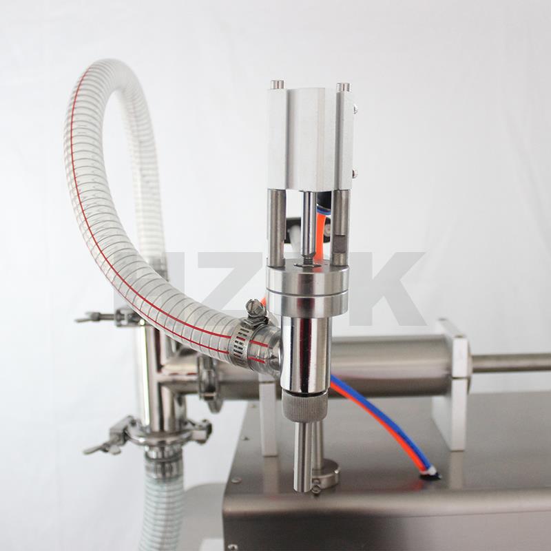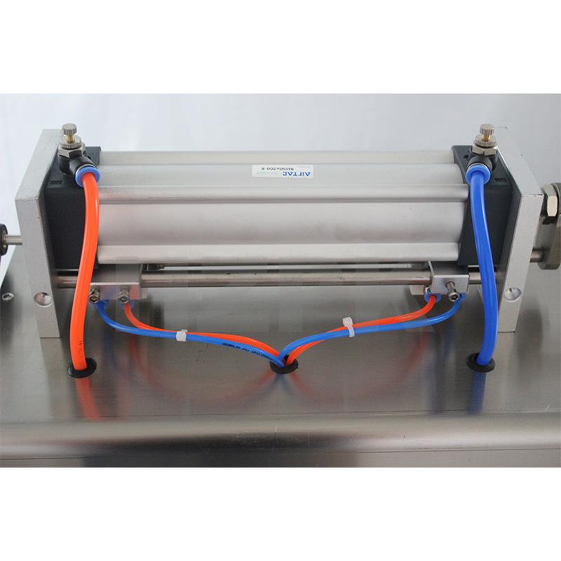 本機為半自動活塞式灌裝機,通過氣缸帶動一個活塞往復來回抽取和打出物料,采用三通止回閥控制物料流向,用碰閥式控制氣缸的行程,可調節灌裝量,可以調解汽缸的進氣量實現快速或者慢速灌裝。